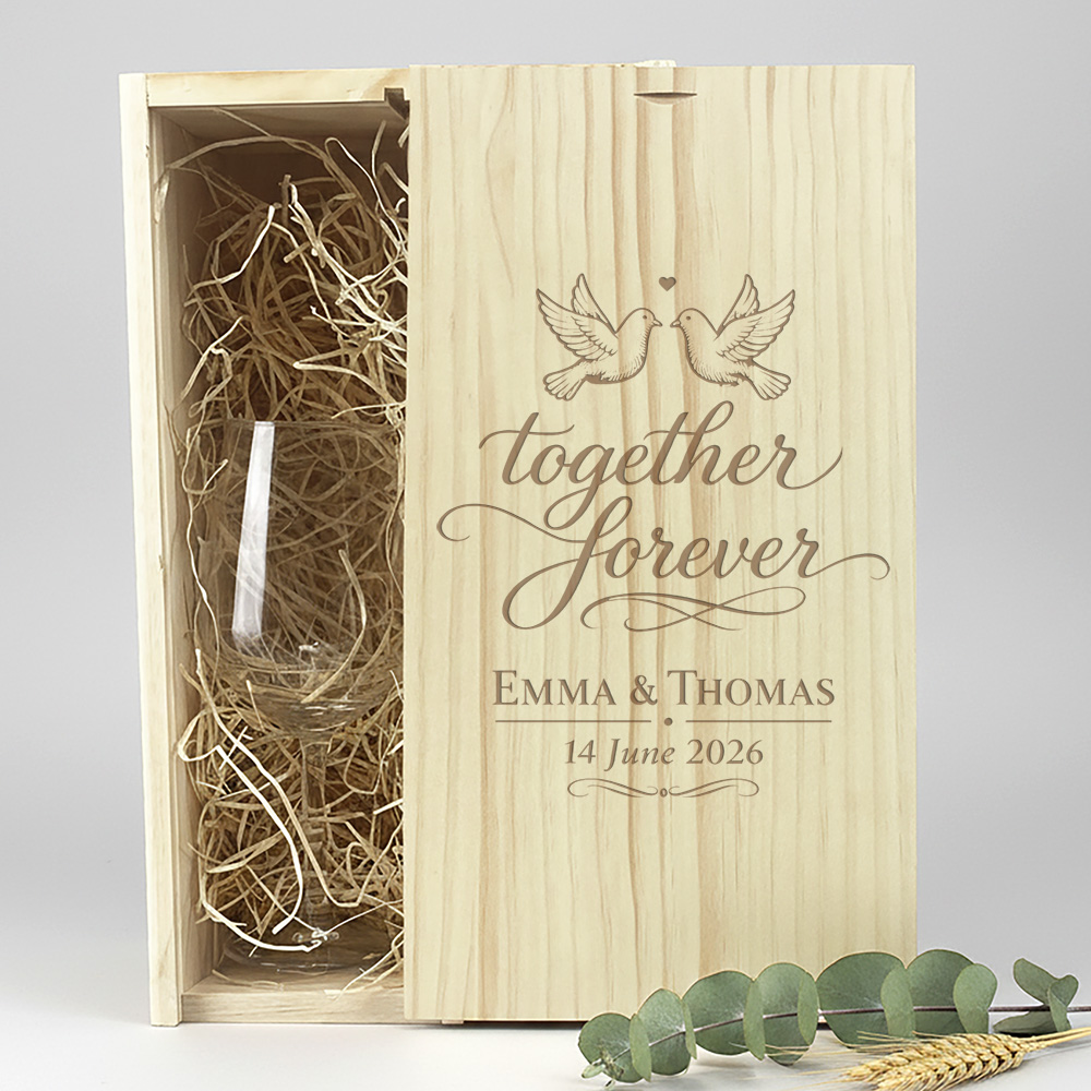 Met een gepersonaliseerd wijn cadeau geef je meer dan alleen een fles wijn: je geeft een herinnering die bewaard blijft. Dit luxe cadeaupakket bestaat uit een royaal gegraveerd wijnglas in een elegante houten wijnkist, volledig te personaliseren met jouw ontwerp. Een naam, datum, symbolische quote of logo maakt jouw cadeau uniek en betekenisvol. Al bij het openen van de kist ontstaat een warm moment van verrassing en waardering – precies wat een persoonlijk cadeau zo bijzonder maakt. Binnenmaten kist: 340x192x95 mm. Één individueel vak is 93×95 mm.