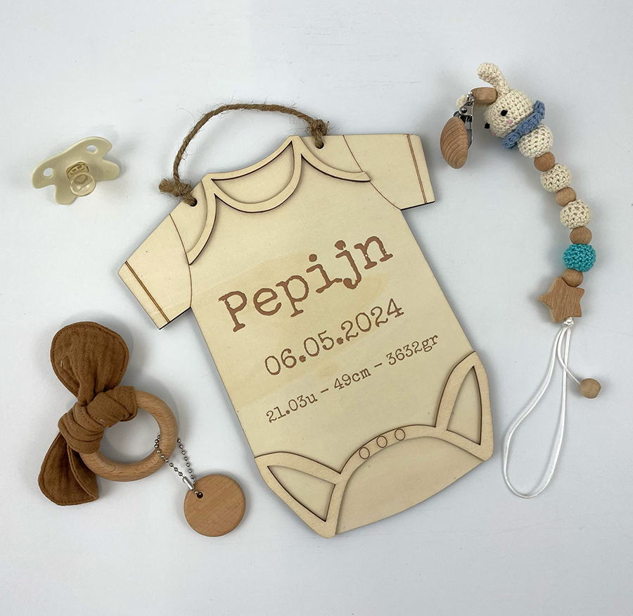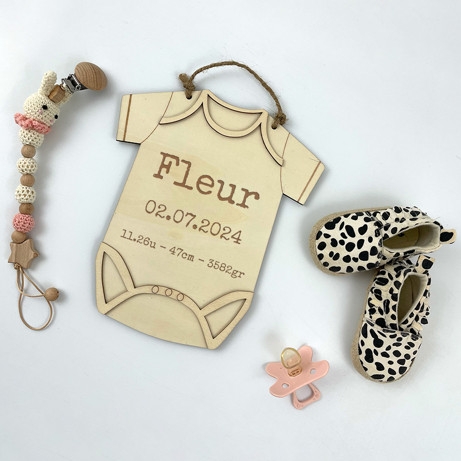 Wat dit cadeau zo bijzonder maakt, is dat het niet alleen voor een feestelijk moment bedoeld is, maar ook blijvend waarde houdt. Ouders kunnen het rompertje ophangen in de babykamer of bewaren als een tastbare herinnering aan de eerste periode van hun kindje. Het duurzame hout en de gravure zorgen ervoor dat het rompertje jarenlang meegaat en steeds opnieuw een glimlach oproept. Voor tips om het hout mooi te houden, bekijk onze onderhoudstips.