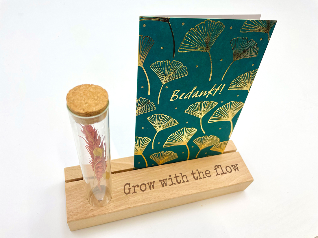 Kaarthouder graveren | Droogbloemen in reageerbuisje