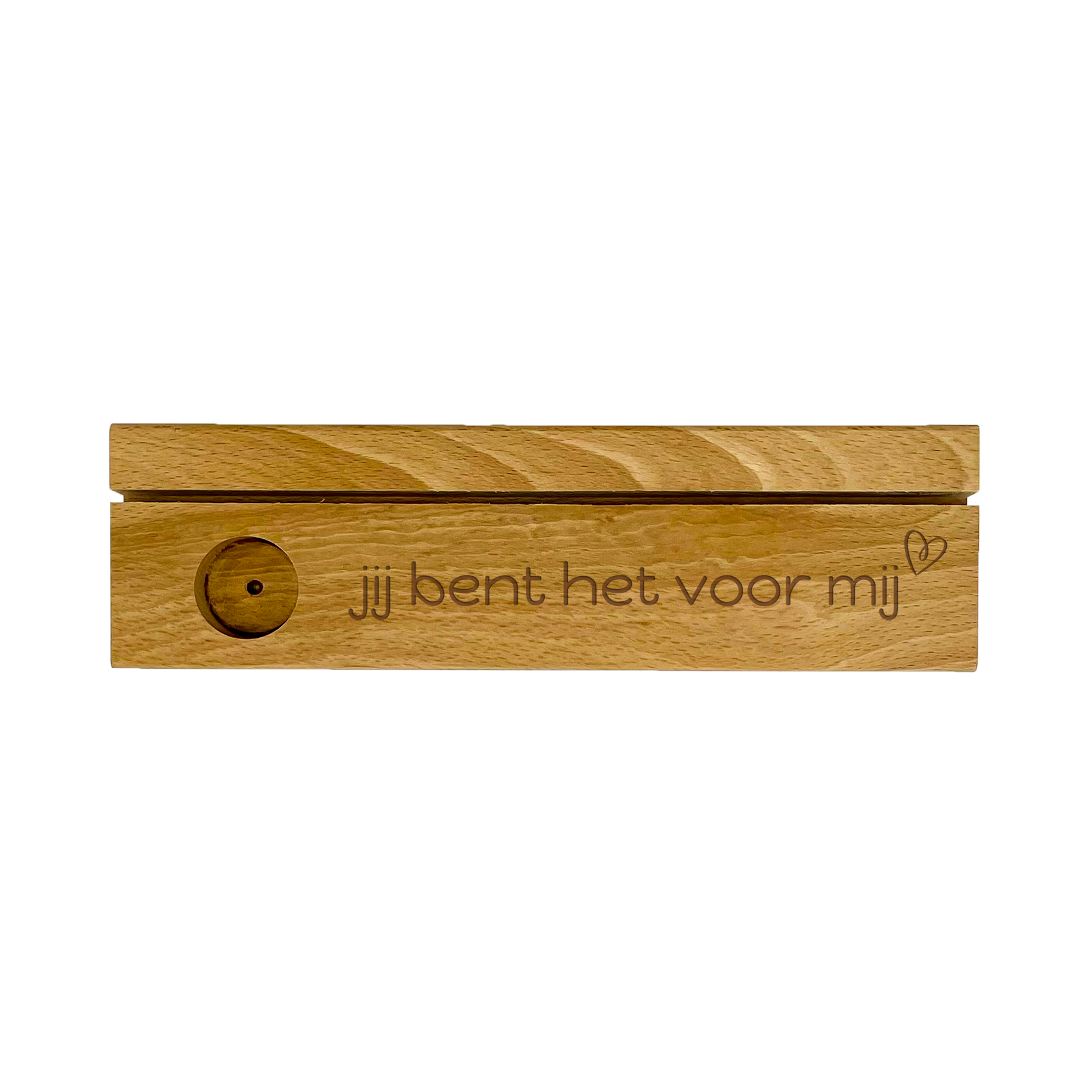 De houten kaarthouder kan worden voorzien van een gravure naar wens. Denk aan een naam, datum of korte boodschap die het cadeau een persoonlijk tintje geeft. Kies bijvoorbeeld voor een lieve tekst als herinnering aan een jubileum, of laat de naam van de ontvanger in sierlijke letters graveren. Voor een zakelijk doel kun je zelfs een logo of bedrijfsnaam toevoegen. Elke gravure maakt de kaarthouder uniek en zorgt voor een blijvende herinnering.