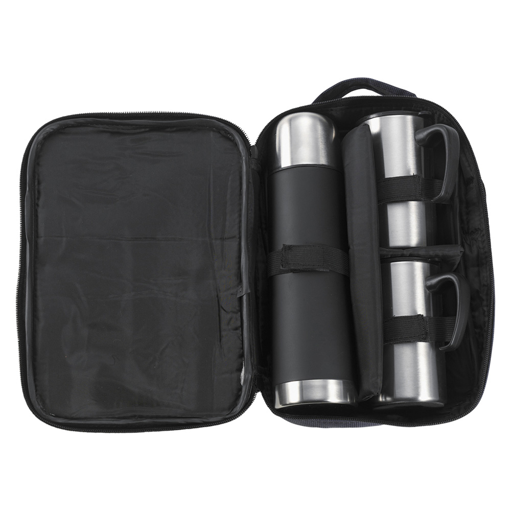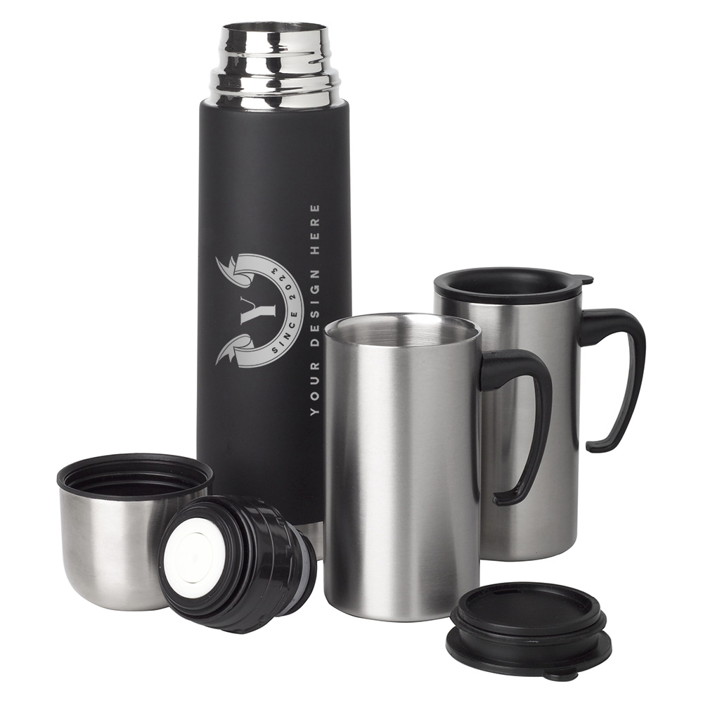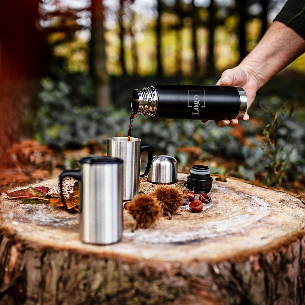 Deze gegraveerde thermosfles set is de perfecte keuze voor zakelijke geschenken of als een attentie voor het personeel in de koude maanden of voor werk dat zich buiten kantoor bevindt. De set bestaat uit een elegante zwarte thermosfles en twee roestvrijstalen bekers van 300ml. De thermosfles houdt de warme dranken urenlang op temperatuur en de bekers kunnen afgesloten worden met een deksel. Laat de thermoskan graveren met jouw eigen ontwerp en maak deze set nog specialer zodat het een uniek cadeau is voor elke ontvanger. Of het nu gebruikt wordt op kantoor, tijdens het reizen of tijdens buitenactiviteiten, deze gegraveerde thermosfles set zal zeker gewaardeerd worden.